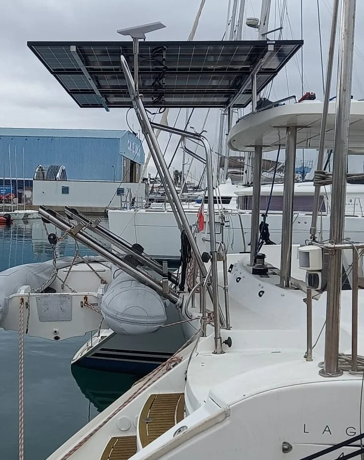 Los paneles solares se situan en un marco de tubo de acero inoxidable fabricado a medida. El arco se fija en la popa de la embarcación y sostiene al mismo tiempo el marco con los paneles solares.